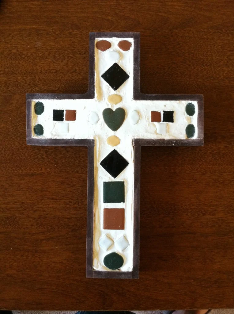 Wonderful Phoebe gave simple step by step directions which, to my relief, made the craft sound actually doable. She pointed out an example of the finished product, handed me a wooden cross, then directed me to bowls and boxes of various tiles in assorted colors. Different tables were set up for the staining area for the wood and the plastering part. I took a deep breath and plunged my hand into the nearest bowl and picked out handfuls of tile. I sat down and started arranging the pattern and glued it down. Sprinkled throughout the assembly process I heard bits of life stories from the women sitting around me. I watched as some women approached the project systematically, placing tiles in order by rows, others arranged by color with more of a mosaic feel. Some used just a few tiles spaced out, others filled their crosses with small tiles. Some worked quickly, others took a long time. No two crosses looked the same. But each one was beautiful.
